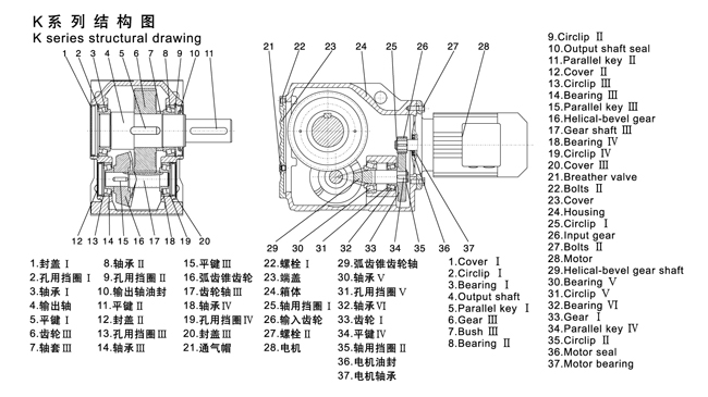 速比范圍:基本型5.36~197.37,K系列/R系列組合型可達到32625扭矩范圍:200~50000 Nm功率范圍:0.18~200 kW結(jié)構(gòu)形式:K-軸伸式、底腳安裝 KA-軸裝式聯(lián)接KF-軸伸式、法蘭安裝 KAF-軸裝式、法蘭安裝S-表示軸輸入